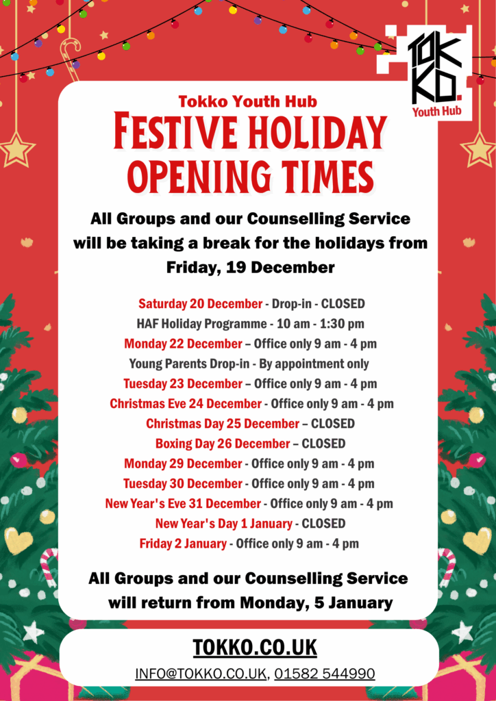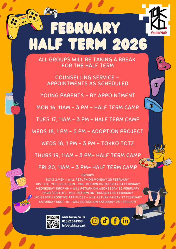 Tokko Youth Hub is a charity in the heart of Luton supporting young people aged 13 yrs – 19 yrs or up to 24 yrs for those with Special Educational Needs (SEND) or young parents. Through weekly group sessions at our purpose-built facility and outreach in schools and the community, we provide a variety of activities and 1:1 support, fostering positive outcomes and holistic development to empower and encourage young people to lead happy and healthy lives.